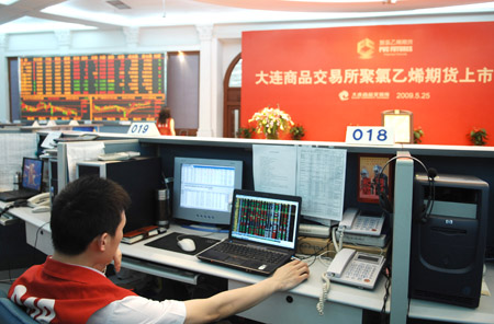 5月25日,一名期貨交易人員在大連商品交易所大廳工作。當(dāng)日,聚氯乙烯(PVC)期貨合約在大連商品交易所上市交易。 新華社記者 姚劍鋒