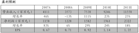 銀河證券預(yù)計(jì),招商地產(chǎn)2009年來(lái)自于房地產(chǎn)的銷(xiāo)售收入約60億元,物業(yè)租賃5.5億元。2009年主營(yíng)收入約76億元,歸屬于母公司凈利潤(rùn)16.65億元,每股收益0.97元。