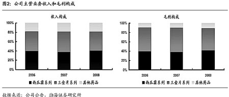 2005至2008年,西瓜霜系列和三金片系列銷量平穩(wěn),其中2007、2008年銷量增長受到產(chǎn)品大幅提價影響,銷售規(guī)模分別為4億元,已經(jīng)進入成熟期。兩系列產(chǎn)品售價較低,價格有上漲空間。桂林西瓜霜是醫(yī)保乙類產(chǎn)品,出廠價和零售價有40%價差,西瓜霜清咽片和西瓜霜潤喉片是自主定價產(chǎn)品,未來西瓜霜系列增長需要靠各產(chǎn)品提價;三金片是中成藥治療泌尿系統(tǒng)感染特色藥,進入醫(yī)保甲類目錄,出廠價和零售價有40%價差,如果進入基本藥物目錄,渠道拓寬可以求得量增但限制了價升,如果進入不了基本藥物目錄,可以求得價升但量增會面臨一定困難,但公司二者只能得一;二線產(chǎn)品腦脈泰和眩暈寧片銷售規(guī)模上千萬,尚處于市場導入期。
