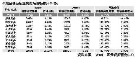二季度以來,兩市交易異;鸨,交易量不斷放大。二季度日均交易額達到2145億元,遠超去年1085億元的平均水平。7月份甚至出現(xiàn)了單天4000億元以上的驚人成交量,日均交易量在3200億以上。而天量成交額帶給券商的是豐厚的利潤。