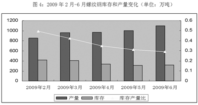 圖4:2009年2月-6月螺紋鋼庫存和產(chǎn)量變化(單位:萬噸)