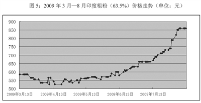 圖5:2009年3月-8月印度粗粉(63.5%)價格走勢(單位:元)