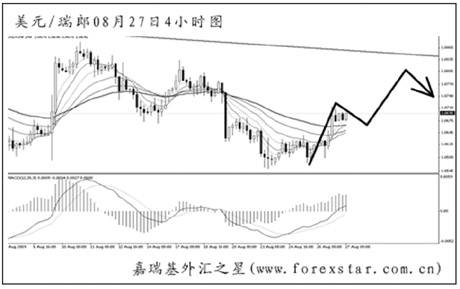 ▲美元兌瑞郎再度創(chuàng)出新低之后仍未能加速下行,日線圖下跌動能持續(xù)減弱。短線匯價波動凌亂,后市有向圖中的下降通道上沿發(fā)起沖擊的欲望。由于低位震蕩的時間已不短,形成階段性底部的可能性正在逐漸加大。