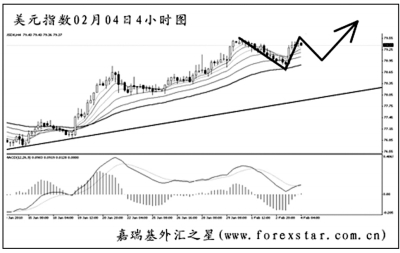 投資人矚目的美聯(lián)儲議息會議以預期中的維持利率不變結束,但會后聲明表達了對經(jīng)濟前景更加樂觀的看法,而且在利率決定投票過程中,堪薩斯聯(lián)儲主席霍恩發(fā)出了反對將利率維持在近零水平的呼聲,這使得市場進一步預期美國或許離加息越來越近,由此引發(fā)的買盤刺激美元全線大幅上揚,美元指數(shù)以一波日線四連陽的強勢突破前期高點,觸及半年以來的新高,周線也實現(xiàn)兩連陽。而中國逐步收緊貨幣政策、投資者對歐元區(qū)成員國財政問題的擔憂以及美國強勁GDP數(shù)據(jù)等因素也在美元的上攻過程中發(fā)揮了不可磨滅的作用。 美聯(lián)儲公開市場委員會的投票情況,以及聯(lián)儲對經(jīng)濟前景更加樂觀的看法,也為未來幾周美元的強勢奠定了基調(diào)。歐洲央行、瑞士央行以及其他幾家央行即將停止與美聯(lián)儲的美元互換操作,該消息進一步鞏固了有關美國經(jīng)濟步入正軌的看法,表明美聯(lián)儲即將踏上緊縮貨幣政策的道路。 美國上周五公布的第四季度GDP數(shù)據(jù)表現(xiàn)強勁,提升了投資者對于美國經(jīng)濟的復蘇進程將快于其他國家的預期,從而也為美聯(lián)儲在此前議息會議聲明中透露出的略顯樂觀的觀點提供了注腳,支持美元進一步走高。美國商務部公布的初步數(shù)據(jù)顯示,2009年第四季度美國經(jīng)濟大幅增長。經(jīng)季節(jié)性因素調(diào)整后,美國去年第四季度GDP年化季率增長5.7%,高于預期的增長4.6%,而且增幅為六年來的最大。在GDP數(shù)據(jù)之外,美國當日公布的其他經(jīng)濟數(shù)據(jù)也表現(xiàn)搶眼,幫助美元擴大了GDP數(shù)據(jù)公布后的漲幅。其中,美國芝加哥供應管理協(xié)會公布,美國1月芝加哥采購經(jīng)理人指數(shù)升至61.5,12月份修正后的數(shù)據(jù)為58.7,12月初值為60。這是該指數(shù)連續(xù)第四個月處于50的榮枯分水嶺上方,而且創(chuàng)下2005年11月以來的新高。此前,市場預計1月份該指數(shù)為57.2。此外,美國1月密歇根大學消費者信心指數(shù)終值升至74.4,初值為72.8,12月終值為72.5。此前,市場預期該指數(shù)1月份終值為73.0。上述經(jīng)濟數(shù)據(jù)表現(xiàn)強勁,市場將其視為美國經(jīng)濟富有彈性的跡象,與此形成對比的是,歐元區(qū)和英國的經(jīng)濟卻顯現(xiàn)出疲軟跡象。這是美元走強的主要原因,預計未來數(shù)周美元將繼續(xù)走高。 從圖上看,美元指數(shù)沿日線圖的上升通道上行,繼續(xù)向81.45的上方強阻力挺進。圖中美元指數(shù)已經(jīng)完成了一波5浪上漲,目前在進行B浪調(diào)整,后市有再度展開C浪下跌的風險。雖然MACD也發(fā)生了頂背離的信號,但從主客觀趨勢上看,美元指數(shù)仍然為漲勢,應繼續(xù)以看多美元為主。