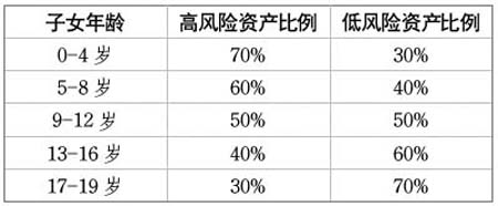 以基金定投方式償債后,王女士家庭每月還有800元凈結(jié)余,建議其從中每月拿出400元進(jìn)行教育金儲(chǔ)備,方式仍可采用基金定投。由于王女士孩子只有三歲,籌備大學(xué)教育金還有將近16年的時(shí)間,故可以選擇部分高風(fēng)險(xiǎn)高收益的資產(chǎn)來(lái)進(jìn)行配置,建議其50%選擇激進(jìn)型,剩余選擇穩(wěn)健型。若按保守的年收益率4%、每月定投400元來(lái)進(jìn)行測(cè)算,在孩子19歲時(shí)可獲得將近11萬(wàn)元的教育基金。 很多父母在為孩子選擇教育金的準(zhǔn)備方式上過(guò)于激進(jìn)或過(guò)于保守,這都是不可取的。投資風(fēng)格激進(jìn)的父母將全部資金配置于高風(fēng)險(xiǎn)資產(chǎn)中,一旦遇到資本市場(chǎng)行情持續(xù)惡劣和低迷的情況,本金會(huì)出現(xiàn)重大虧蝕。而投資風(fēng)格保守的父母又會(huì)將全部資金進(jìn)行銀行儲(chǔ)蓄,分析近20年的歷史來(lái)看,不僅國(guó)內(nèi)外的教育費(fèi)用均是逐年遞增的,且通貨膨脹也在侵蝕著我們儲(chǔ)蓄賬戶中的資金。由此,合理選擇教育金的準(zhǔn)備方式尤為重要,建議牢記兩個(gè)原則:一是無(wú)論您的風(fēng)險(xiǎn)承受能力如何,一定要保持至少30%的無(wú)風(fēng)險(xiǎn)資產(chǎn)的配置;二是越是臨近教育金使用的期限,越是要降低高風(fēng)險(xiǎn)資產(chǎn)的比例。 下列資產(chǎn)配置比例可供年輕的父母?jìng)冏鰠⒖迹?/P>