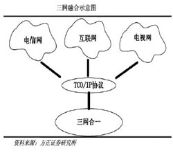 什么是“三網(wǎng)融合”?方正證券在報(bào)告中是這么定義的:“三網(wǎng)融合”是指電信網(wǎng)、計(jì)算機(jī)網(wǎng)和有線電視網(wǎng)三大網(wǎng)絡(luò)通過(guò)技術(shù)改造,提供包括語(yǔ)音、數(shù)據(jù)、圖像等綜合多媒體的通信業(yè)務(wù)。 方正證券認(rèn)為,“三網(wǎng)融合”是業(yè)務(wù)的整合,它不僅繼承了原有的話音、數(shù)據(jù)和視頻業(yè)務(wù),而且通過(guò)網(wǎng)絡(luò)的整合,衍生出了更加豐富的增值業(yè)務(wù)類型,如圖文電視、VOIP、視頻郵件和網(wǎng)絡(luò)游戲等,極大地拓展了業(yè)務(wù)提供的范圍;“三網(wǎng)融合”應(yīng)用廣泛,遍及智能交通、環(huán)境保護(hù)、政府工作、公共安全、平安家居、智能消防、工業(yè)監(jiān)測(cè)、老人護(hù)理、個(gè)人健康等多個(gè)領(lǐng)域。 以后的手機(jī)可以看電視、上網(wǎng),電視可以打電話、上網(wǎng),電腦也可以打電話、看電視。三者之間相互交叉,形成你中有我、我中有你的格局。隨著三網(wǎng)時(shí)代的到來(lái),國(guó)人的生活將會(huì)更美好。