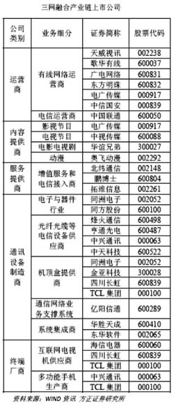 “三網(wǎng)融合”的推進(jìn),無(wú)疑將拉動(dòng)一條產(chǎn)業(yè)鏈升級(jí)。但是,在東方證券看來(lái),真正利好的是內(nèi)容產(chǎn)業(yè)。 該券商的報(bào)告表示,市場(chǎng)可能認(rèn)為“三網(wǎng)融合”對(duì)有線網(wǎng)絡(luò)是特大利好,但在雙向進(jìn)入的情況下,有線企業(yè)將直面電信企業(yè)的競(jìng)爭(zhēng)。我國(guó)當(dāng)前地域分割的有線網(wǎng)絡(luò)企業(yè)運(yùn)營(yíng)能力和資本完全無(wú)法與電信企業(yè)相抗衡,“三網(wǎng)融合”真正利好的是內(nèi)容產(chǎn)業(yè)。 因?yàn)椤叭W(wǎng)融合”意味著渠道的更加多元化。對(duì)內(nèi)容產(chǎn)業(yè)而言,意味著有更多的分發(fā)渠道,有更多的受眾資源,無(wú)論他、她以前是有線網(wǎng)的用戶,還是電信、互聯(lián)網(wǎng)的用戶,內(nèi)容企業(yè)可以有更多的機(jī)會(huì)與其接觸。就像3G網(wǎng)絡(luò)的推出,眾多的互聯(lián)網(wǎng)企業(yè)可將其平臺(tái)移植到3G網(wǎng)絡(luò),增加了受眾人群。 第一創(chuàng)業(yè)則在報(bào)告中具體展望說(shuō),隨著“三網(wǎng)融合”進(jìn)程的加快,有線電視公司未來(lái)將有望提供語(yǔ)音服務(wù),電信運(yùn)營(yíng)商IPTV的發(fā)展也將加快,電信和廣電企業(yè)將既有競(jìng)爭(zhēng)又有合作。 報(bào)告表示,年初的國(guó)務(wù)院會(huì)議明確了符合條件的廣播電視企業(yè)可以經(jīng)營(yíng)增值電信業(yè)務(wù)和部分基礎(chǔ)電信業(yè)務(wù)、互聯(lián)網(wǎng)業(yè)務(wù)。原來(lái)部分有線電視公司已經(jīng)在提供寬帶上網(wǎng)的互聯(lián)網(wǎng)服務(wù),此次提法意味著未來(lái)有線電視公司有希望提供VoIP電話服務(wù)。“三網(wǎng)融合”將使有線電視公司的業(yè)務(wù)范圍大為拓展,增加收入來(lái)源。 同時(shí),電信運(yùn)營(yíng)商在一些城市已經(jīng)推出了IPTV電視收看業(yè)務(wù),預(yù)計(jì)未來(lái)IPTV將在更多的城市推廣,但其網(wǎng)絡(luò)基礎(chǔ)和收視質(zhì)量需要有較大的提高才能與有線電視競(jìng)爭(zhēng)。 廣電企業(yè)有豐富的節(jié)目資源,而電信運(yùn)營(yíng)商有市場(chǎng)化的優(yōu)秀營(yíng)銷能力,未來(lái)兩者雖然在進(jìn)入對(duì)方的固有領(lǐng)域時(shí)存在一定的競(jìng)爭(zhēng),但同時(shí)又存在互相合作互補(bǔ)的需要。 方正證券也認(rèn)為,隨著內(nèi)容運(yùn)營(yíng)許可權(quán)的放開(kāi),廣電運(yùn)營(yíng)商的增長(zhǎng)空間將迅速開(kāi)啟,付費(fèi)頻道、影視、電視支付、游戲、購(gòu)物等增值業(yè)務(wù)都可以成為運(yùn)營(yíng)商新的利潤(rùn)增長(zhǎng)點(diǎn)。