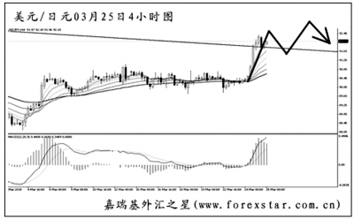 ▲美元兌日元經(jīng)過了10多天的盤整走勢后,突然發(fā)力上行。圖中上方的壓力線為周線圖中形成,能否升破成為美元兌日元后市繼續(xù)上沖的關(guān)鍵。目前上方的阻力位在年初的高點93.80,此位置同時也是周線圖均線系統(tǒng)的壓制位,所以美元兌日元短時間內(nèi)走出凌厲的漲勢并不現(xiàn)實。