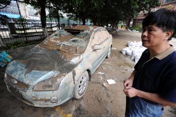 5月11日,在廣州大道金穗大廈院內(nèi),市民黃先生看著被水浸破損嚴重的小車欲哭無淚。新華社記者 劉大偉/攝