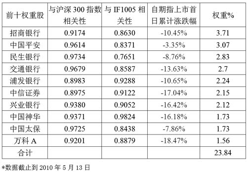 滬深300指數(shù)是滬深300指數(shù)期貨的現(xiàn)貨指數(shù),期指上市近一個月以來滬深300和IF1005相關(guān)性高達0.9939。通過格蘭杰因果關(guān)系檢驗分析,我們發(fā)現(xiàn)滬深300的變動是IF1005變動的原因,也即前者對后者起著引導作用。所以分析滬深300權(quán)重股的走勢對預測期指的走勢具有重要參考意義。 在滬深300指數(shù)前十大權(quán)重股中有五只銀行股、兩只保險股、一只券商股、一只能源股和一只地產(chǎn)股。這十只股票占滬深300指數(shù)的權(quán)重達到了23.84%。它們與滬深300指數(shù)的相關(guān)性也非常高,都在0.89以上。 從這十只股票的漲跌幅來看,受地產(chǎn)調(diào)控政策影響的萬科跌幅達18.47%,中信證券自5月4日復牌后,到13日累計跌幅也達17.04%。權(quán)重股的巨大跌幅是拖累現(xiàn)指和期指下行的最重要因素。 從行業(yè)基本面來看,銀行、地產(chǎn)等板塊基本面在國家宏觀調(diào)控下都偏弱,這也給股指和期指的中期偏弱運行定下了主基調(diào)。