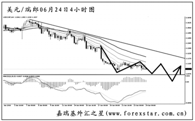 ▲美元兌瑞郎短線加速下跌,自高位下挫的力度強(qiáng)勁,現(xiàn)在在構(gòu)筑次要節(jié)奏調(diào)整。圖中均線系統(tǒng)壓制排列,匯價(jià)距離下降趨勢線較遠(yuǎn),后市仍有繼續(xù)創(chuàng)新低的欲望。目前美元兌瑞郎距下方道氏理論強(qiáng)支撐1.0925已經(jīng)不遠(yuǎn),短線依舊看空,但預(yù)計(jì)直接跌破有一定難度。