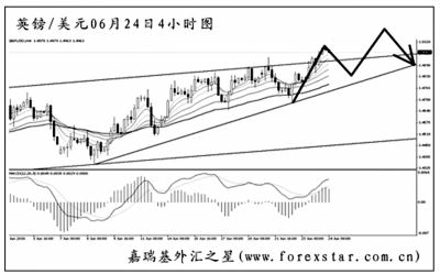 ▲英鎊兌美元運(yùn)行到了大級別旗形中繼的上沿,并已將上沿小幅升破。目前還不能確定旗形中繼失敗,需重點(diǎn)關(guān)注1.5055一線的阻力,若英鎊將此位置突破,則中線的下跌將告一段落,后市轉(zhuǎn)為看漲思路。預(yù)計(jì)短線匯價(jià)還將有一波回落,考驗(yàn)趨勢線的作用。