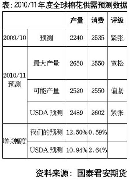 近段時間以來,國內棉花價格穩(wěn)步上漲,并成功站上高位。不斷擴大的銷售利潤使得供給方變得更加惜售,在全社會可供總量非常緊張的情況下,下游企業(yè)不得不被動接受高昂的棉價。在接下來的7-8月,由于社會庫存的進一步消耗,棉花的供應形勢可能更加緊張,棉花價格由于缺乏有效的利空作用,還看不到要下跌的任何跡象。因此,從短期來看,支持棉價上漲的因素依然存在,棉價繼續(xù)上漲是大概率事件。 當前棉花價格的高企歸功于供需關系的相對緊張。2009年8月份以來,全球棉花供需關系開始由緩和轉變?yōu)橼吘o(產(chǎn)量減少、消費增加),棉花價格也隨之大幅度上漲。美國農(nóng)業(yè)部6月供需報告顯示,全球2009/10年度棉花產(chǎn)量預估為1.0289億包,2008/09年度棉花產(chǎn)量預估為1.0740億包。6月份預估消費為1.1643億包,2008/09年度預估消費為1.0994億包,增加647萬包。在全球經(jīng)濟從歷史的低谷逐步走出來以后,商品價格集體回暖為棉花價格上漲提供了可靠的大環(huán)境,而惡化的供需矛盾則為棉價安裝上了騰飛的翅膀。 但2010/11年度棉花價格有望從高位回落。因為高價格會刺激棉花主產(chǎn)區(qū)面積擴種,從而會極大地緩和供需偏緊的基本格局。根據(jù)我們的預測,2010/11年度,全球棉花產(chǎn)量將從本年度的2240萬噸增加到2520萬噸,合計增產(chǎn)280萬噸,增幅為12.50%。產(chǎn)量增加使得“供需情況”得到很好改善,并對基金多頭形成威懾,使得多逼空的可能性進一步減小,價格繼續(xù)上漲的動力被有效削弱。 歷史經(jīng)驗告訴我們,高價格往往難以為繼。預計到2010年12月份,棉花價格也有望從目前的18000元/噸回落到14000-16000元/噸的核心區(qū)域,價格下跌的最可能月份大概在10月份以前。