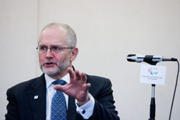 他從小就很喜歡體育:游泳、網(wǎng)球、板球,還有橄欖球。然而,16歲的時候,在一次登山過程中,他從十米高的地方摔了下來,傷及背部,從那以后,他的人生之路只能在輪椅上前行。對于體育的熱愛,讓他很快迷上了輪椅籃球……殘奧體育使他的人生充滿樂趣。 他就是國際殘奧委主席菲爾·克雷文先生。10月23日,克雷文來到北京,介紹殘奧會最新的籌備情況。在接受本報記者專訪過程中,輪椅上的他一直面帶笑容。他說,大家可能聽說過一句話:“兩個奧運,同樣精彩”,這句話說起來容易,做起來很難。要實現(xiàn)同樣精彩,我們必須付諸行動。