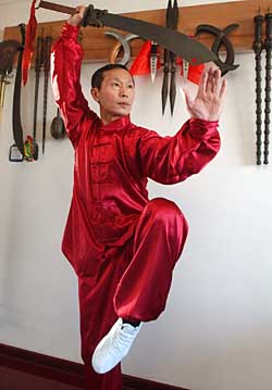 在看過(guò)了短兵器后,趙金城又如數(shù)家珍地說(shuō)起他收藏的長(zhǎng)兵器。他說(shuō),長(zhǎng)兵器比較容易辨認(rèn),有槍、叉、戟、鏟,還有洪門(mén)樸刀和青龍偃月大刀。說(shuō)著說(shuō)著,趙金城還拿起一把青龍偃月刀,熟練地“秀”起刀法來(lái)。