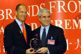 在美國拉斯維加斯舉行的國際消費電子展上,由國際數(shù)據(jù)集團、瑞德商業(yè)咨詢集團、中國電子商會主辦,美國市場調(diào)查及預測公司協(xié)辦的中國十大消費電子領(lǐng)先品牌評選活動揭曉,海爾位居中國十大消費電子領(lǐng)先品牌榜首,充分體現(xiàn)了海爾全球化戰(zhàn)略在國際上的影響力。圖為海爾美國貿(mào)易公司總經(jīng)理邁克先生(右)代表領(lǐng)獎。吳明