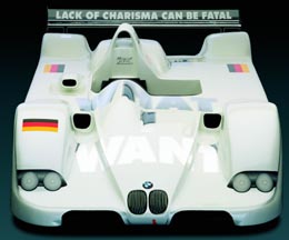 V12 LMR 藝術(shù)車。珍妮·霍爾澤的設(shè)計(jì)使用了她于先前作品“格言與 常在”中的六個(gè)短句,以鍍鉻字母和磷光涂料表現(xiàn)。珍妮·霍爾澤對(duì)代 表BMW的藍(lán)色與白色情有獨(dú)鐘,她讓這兩種顏色在24小時(shí)的馬拉松大賽 中盡現(xiàn)眼底——鍍鉻字母可在白天反映天空,而磷光涂料可在晚上散發(fā)出藍(lán)光。