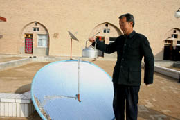 近年來,在國家農(nóng)業(yè)部、發(fā)改委的大力支持下,甘肅省先后實(shí)施了“生態(tài)家園富民計(jì)劃”、“農(nóng)村小型公益設(shè)施補(bǔ)助資金農(nóng)村能源”和“農(nóng)村沼氣利用國債”等一系列新能源利用和生態(tài)保護(hù)綜合項(xiàng)目。截至目前,甘肅省農(nóng)民使用太陽灶達(dá)超過50萬臺(tái),居全國第一位;建成農(nóng)村戶用沼氣池12.3萬個(gè),相當(dāng)于每年可減少砍伐林地30萬畝,節(jié)約煤炭10萬余噸。圖為甘肅省慶陽市華池縣悅樂鎮(zhèn)新堡子村農(nóng)民龐平剛正在用太陽能熱水器燒開水。 |