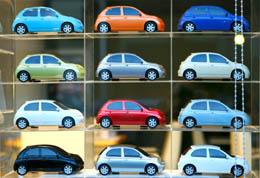 圖為日本東京一家汽車銷售店,銷售商將某汽車廠商生產(chǎn)的多款微型車模型擺在櫥窗里,以吸引顧客。本報(bào)記者:任正來 攝 |