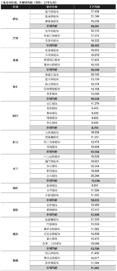 上海各區(qū)域、各板塊均價(jià)(單位:元/平方米)