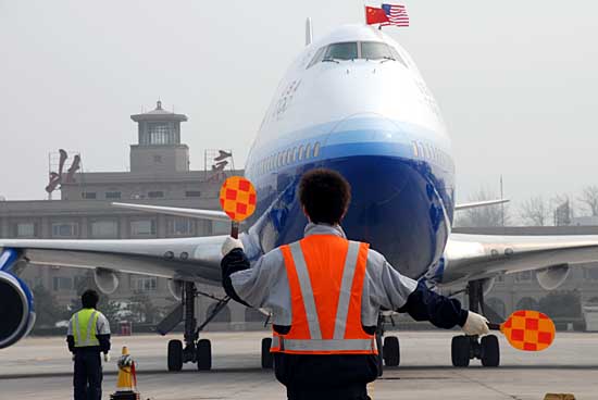 3月29日,華盛頓至北京直航班機(jī)在工作人員指揮下入位。當(dāng)日14時(shí)21分,從美國華盛頓起飛的UA897航班降落在北京首都國際機(jī)場。至此,由美國聯(lián)合航空公司乘運(yùn)的華盛頓至北京直航正式開通。