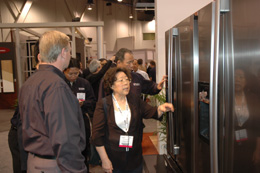 日前在美國拉斯韋加斯開幕的國際廚衛(wèi)設(shè)備展上,海爾推出的全球首臺超級空間法式對開門冰箱成為展會的一大亮點(diǎn)。這種冰箱在世界屬于首創(chuàng),以容積大、技術(shù)先進(jìn)、價格高等因素成為高端冰箱市場的代言產(chǎn)品。圖為展會上海爾集團(tuán)總裁楊綿綿在向客戶和觀眾介紹海爾新近推出的超級空間法式對開門冰箱。