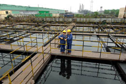 近年來,江西新余鋼鐵有限責任公司通過科技進步節(jié)能減排走循環(huán)經(jīng)濟的道路,加大了“三廢”綜合利用,2006年,企業(yè)利用廢氣余熱發(fā)電達3.74億千瓦時,廢水排放量年減少1634.4萬噸,廢渣年處理能力數(shù)120萬噸,通過變廢為寶,年增收3億多元。圖為兩名員工正在對工業(yè)凈化水進行取樣檢測。