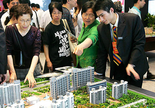6月7日,幾位觀眾在一樓盤模型前看房。當日,第二十一屆中國上海房地產(chǎn)展示交易會在上海展覽中心開幕。本屆房交會展示面積1萬多平方米,共有150余個樓盤,600多萬平方米的普通住宅和精裝修住宅亮相。