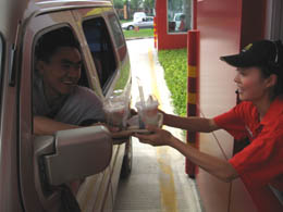 近日,四川首家汽車快餐店亮相成都,車主無需停車即可購買到快餐食品,極大地方便了開車的顧客。