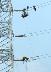 天津電力建設史上規(guī)模最大、線路最長的電網(wǎng)工程——東麗500千伏輸變電工程,已進入后期施工階段。圖為施工人員在酷暑下進行放線施工。