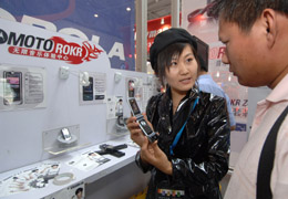 參展人員向參 觀者介紹新型手機(jī)功能。 |