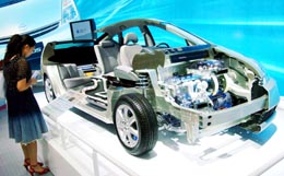 一位觀眾正在觀看被“解剖”的豐田混合動(dòng)力轎車普銳斯。 被“解剖”的上海大眾“明銳”轎車。