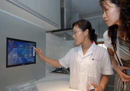 日前,海信集團在青島海信研發(fā)中心正式發(fā)布命名為“DNet-home”的數(shù)字家庭系統(tǒng)標準第一版。在參照“DNet-home”標準建造的數(shù)字家庭體驗館內(nèi),通過一部可隨身攜帶的平板電腦,業(yè)主就能在房屋內(nèi)的任何一個位置,對家中的電視、空調(diào)、電話、電冰箱、保安系統(tǒng)和智能監(jiān)控系統(tǒng)進行設(shè)定和更改,同時通過移動電話、互聯(lián)網(wǎng)絡(luò)等設(shè)備還可對家中所有電子設(shè)備進行遠程遙控。 圖為研發(fā)人員在演示多媒體廚房控制系統(tǒng)。 |