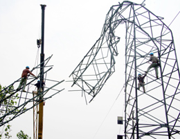江蘇省泰州市高港區(qū)日前遭遇龍卷風(fēng)襲擊,造成4座110千伏高壓供電鐵塔損毀,1200多戶村民家中斷電,寧(南京)通(南通)高速公路高港段封路兩個小時。圖為電力施工人員搶修被龍卷風(fēng)損毀的高壓供電鐵塔。