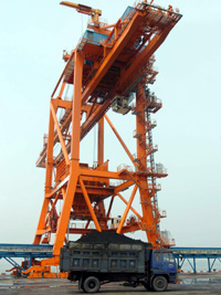 2006年6月建成投產(chǎn)的廣西欽州市欽州港區(qū)7萬(wàn)噸煤炭專(zhuān)業(yè)碼頭,現(xiàn)正式對(duì)外營(yíng)業(yè)。項(xiàng)目建成7萬(wàn)噸泊位和2000噸級(jí)泊位各一個(gè),總投資6億元,年吞吐能力400萬(wàn)噸。圖為天盛7萬(wàn)噸煤炭專(zhuān)業(yè)碼頭的主吊塔。 |