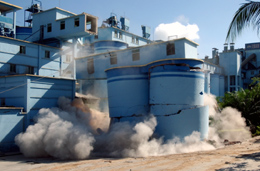 毗鄰三亞市區(qū)的華盛天涯水泥有限公司總廠拆除工作日前啟動(dòng)。該公司的兩個(gè)水泥廠采用立窯生產(chǎn)方式,能耗高、污染大,三亞市政府為落實(shí)節(jié)能減排,保護(hù)生態(tài)環(huán)境,決定拆除這一水泥廠。圖為水泥散裝車間被拆除倒塌。