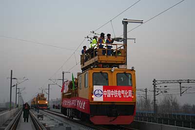 12月12日,我國首條時速達(dá)350公里的高速鐵路客運(yùn)專線——京津城際鐵路第一條接觸網(wǎng)導(dǎo)線成功架設(shè),標(biāo)志著京津城際鐵路電氣化工程架線施工全面展開。京津城際鐵路電氣化工程引進(jìn)德國高速鐵路技術(shù),全長115公里,將于北京奧運(yùn)會前投入使用。屆時京津通達(dá)只需半小時,且5分鐘發(fā)一次車。圖為承擔(dān)施工任務(wù)的中鐵電氣化局一公司的職工在架設(shè)接觸網(wǎng)導(dǎo)線!