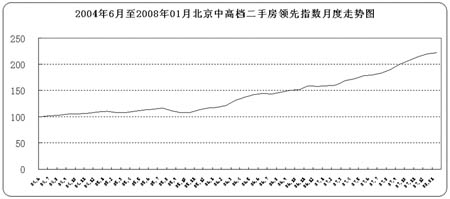 2008年1月,北京中高檔二手房成交價(jià)格為13408.3元/平方米,中原(北京)領(lǐng)先指數(shù)為222點(diǎn),環(huán)比上月上漲1.22%,與2007年12月價(jià)格增幅相比仍呈趨緩走勢(shì)。同時(shí),北京中高檔二手房買賣成交量環(huán)比上月下浮15.65%。由此可見(jiàn),北京中高檔二手房市場(chǎng)仍持續(xù)價(jià)升量降現(xiàn)象。