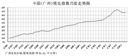 2008年2月,中原(廣州)領(lǐng)先指數(shù)為166.4,環(huán)比下降0.2,降幅僅為0.1%。自去年12月中原領(lǐng)先指數(shù)出現(xiàn)大幅度的下滑,其后三個(gè)月價(jià)格連續(xù)下跌,但跌幅逐月收窄,到本月止,降幅已經(jīng)由2.7%減少到了0.1%,價(jià)格走勢(shì)已明顯止住了跌勢(shì),有回歸穩(wěn)定的跡象。