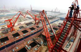 中國船舶工業(yè)集團公司長興造船基地地處上海吳淞口外長興島,被稱為中國“巨輪島”。2008年,預計該基地總投資150億元的一期工程將竣工,在島上“出生”的萬噸巨輪將達9艘。該基地的船舶產(chǎn)品包括大型油輪、液化天然氣船、超大型集裝箱船等,造船訂單已排到2011年。整個基地分兩期建設,計劃2015年建成。屆時,這個基地將擁有7個大船塢,年造船能力達1200萬噸。