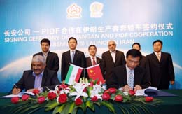 5月30日,長安汽車與伊朗PIDF集團正式在重慶長都假日酒店簽署雙方合作在伊朗生產(chǎn)長安奔奔的協(xié)議。該協(xié)議內(nèi)容包括技術(shù)轉(zhuǎn)讓及零部件供應(yīng)等一攬子合同,初期生產(chǎn)線建設(shè)規(guī)模為5萬輛,并最終達到25萬輛年產(chǎn)量的規(guī)模。 按照雙方達成的協(xié)議,今年年底,長安將全部完成在伊朗建線的設(shè)備準(zhǔn)備,從明年上半年開始正式投產(chǎn)。