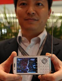 日前,中國首個移動多媒體體驗中心在北京中關村揭幕,這標志著中國的移動多媒體廣播全面進入商用時代。北京奧運會期間,人們可以通過手機等便攜電子產(chǎn)品隨時隨地看奧運比賽。圖為創(chuàng)毅視訊科技有限公司工作人員在展示用手機收看電視。