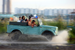 7月12日,在俄羅斯首都莫斯科前圖希諾機(jī)場(Airport Tushino),人們開著吉普車從水中駛過。當(dāng)日,2008汽車風(fēng)情展(Autoexotic 2008)莫斯科站正式對公眾開放,汽車愛好者們開著自己的愛車聚集在這里,交流車技和改裝、保養(yǎng)車輛的知識,分享對汽車和駕駛的熱愛之情,觀看表演品嘗美食,享受夏日時光。