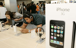 日前,3G版iPhone手機在全球22個國家和地區(qū)上市,引發(fā)蘋果迷們的購買熱潮。圖為在美國紐約的一家蘋果專賣店,顧客在體驗3G版iPhone手機。新華社記者:侯俊
