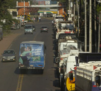 國(guó)際油價(jià)的大幅上漲使得石油嚴(yán)重依賴(lài)進(jìn)口的巴拉圭面臨嚴(yán)重的能源危機(jī),巴拉圭石油公司(Petropar)至今仍拖欠外國(guó)石油公司3.2億美元的費(fèi)用,國(guó)內(nèi)成品油供應(yīng)嚴(yán)重不足。近30%的公交車(chē)和出租車(chē)因?yàn)槿庇蜔o(wú)法工作,正在收割季節(jié)的農(nóng)業(yè)部門(mén)也因?yàn)槿加凸⿷?yīng)不足蒙受巨大損失。圖為7月15日,巴拉圭首都各加油站的運(yùn)油車(chē)在巴拉圭石油公司大門(mén)前排起長(zhǎng)隊(duì),等待加油。 |