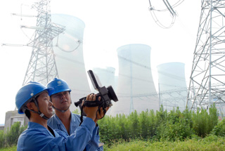 安徽淮南供電職工利用紅外線測溫儀對大唐洛河發(fā)電廠輸往華東電網(wǎng)線路進行監(jiān)測,確保電網(wǎng)安全運行。新華社發(fā)(陳彬