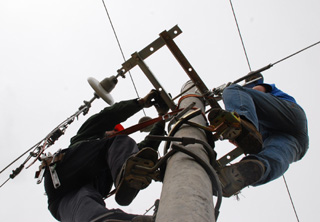 長期以來,青海牧區(qū)的藏族牧民只能依靠自家的太陽能光伏板發(fā)電,電流量小、電壓不穩(wěn),大多數(shù)家用電器無法使用。國家電網(wǎng)公司在青海省啟動(dòng)“戶戶通電”工程后,大電網(wǎng)不斷向牧區(qū)延伸入戶,為10多萬藏族牧民送上了放心電力。圖為青海省興海供電公司施工人員在為莫多村架設(shè)“戶戶通電”線路。