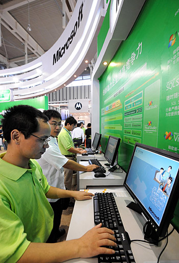 9月24日,微軟公司展位工作人員在進(jìn)行產(chǎn)品與技術(shù)展示。當(dāng)日,以“軟件外包與數(shù)字城市”為主題的第四屆中國(guó)(南京)國(guó)際軟件產(chǎn)品博覽會(huì)在南京國(guó)際博覽中心開(kāi)幕。22個(gè)國(guó)家和地區(qū)組團(tuán)或派代表參會(huì),包括微軟、摩托羅拉、英特爾、富士通、惠普、富士康、愛(ài)立信等在內(nèi)的338家企業(yè)參展。 | |