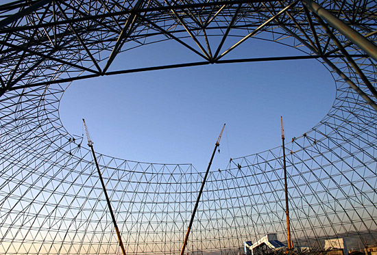 近日,呼和浩特鐵路局包頭古城灣萬噸環(huán)保煤炭裝車基地基本建成并試運(yùn)行。圖為正在安裝的古城灣煤炭裝車基地3號儲煤倉。