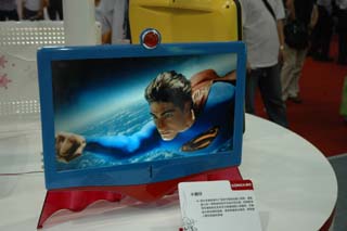 在日前舉行的第十屆中國國際高新技術成果交易會上,康佳集團推出了幾款專門給孩子看的個性化彩電,有仿摩托車的“小騎士”彩電,有像小女孩的布娃娃和公主裙的“小可愛”彩電。圖為“小超仔”彩電,借鑒超人的一些明顯特征作為設計元素,采用紅色半透明的亞克力來展現(xiàn)超人的披風。